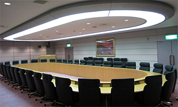 固定式の円形卓には36名がゆったりと座ることが出来、役員会議や国際会議などに最適です。また、4ヵ国語までの同時通訳※に対応できます。