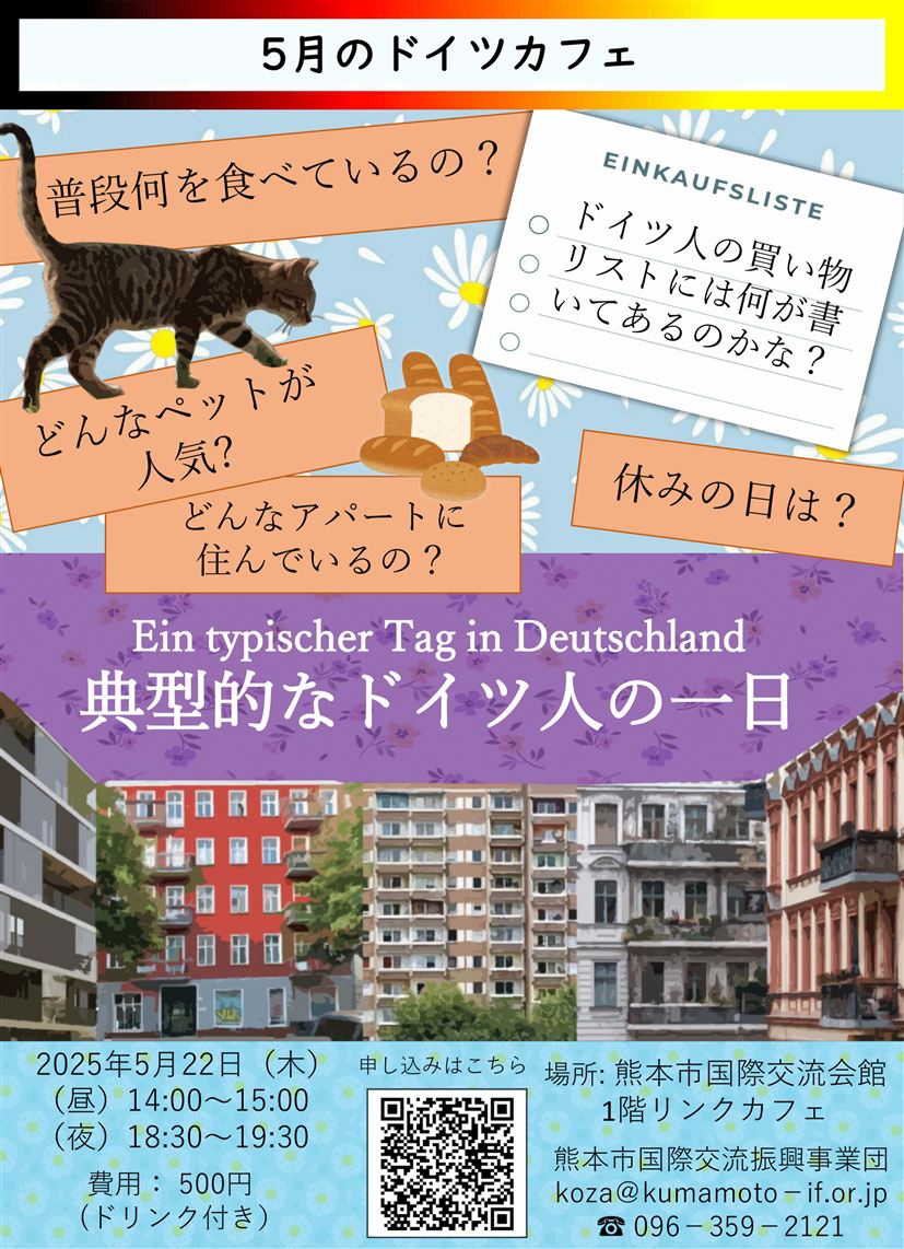 熊本の皆さま、令和5年8月に着任いたしましたドイツ出身のマリア・ヴォーニヒと申します。これから私の出身国であるドイツをご紹介するとともに、毎週水曜日にはドイツ相談を担当させていただきます。どうぞよろしくお願いいたします。ドイツに興味がある方、ドイツ語を話してみたい方、発音を聞いてみたい方、是非、お気軽にお越しください。