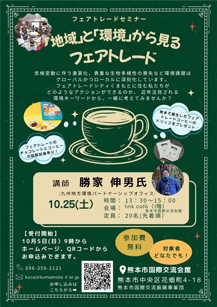 2011年6月、熊本市がフェアトレードタウンに認定されてから広がりを見せてきたフェアトレード。本年度もフェアトレードの取り組みや他都市の状況、身近な商品や体験談などについても学ぶ講座を開催します。