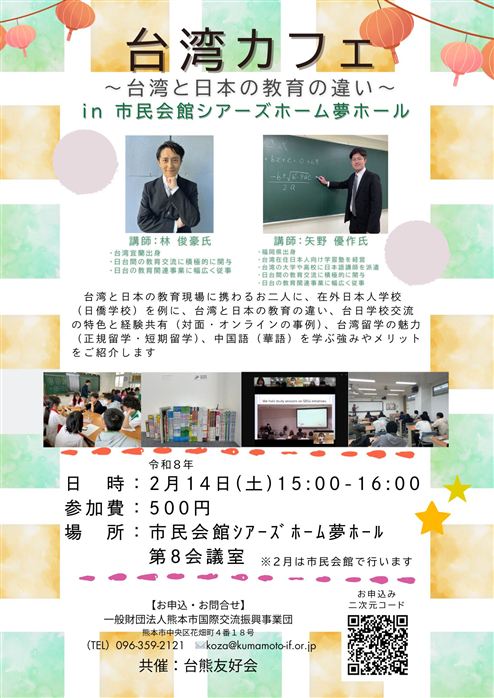 台湾と日本の教育現場に携わるお二人に、在外日本人学校( 日僑学校) を例に、台湾と日本の教育の違い、台日学校交流の特色と経験共有( 対面・オンラインの事例)、台湾留学の魅力、正規留学・短期留学)、中国語( 華語) を学ぶ強みやメリットをご紹介します